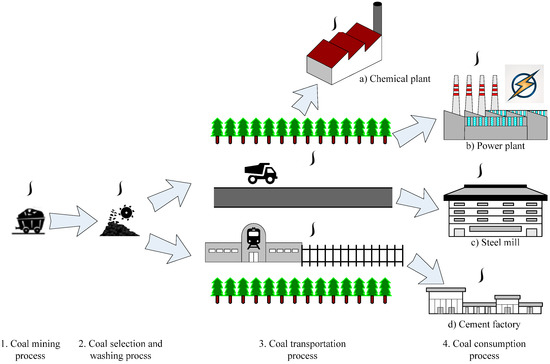 The exploitation method, transportation path, and consumption type are the important sectors that affect carbon emissions in the complete coal supply chain. In the process of coal mining and selection and washing, the main carbon sources are from coal, electricity and energy consumption, and also include coalbed methane released in the mining process [45]. The carbon emissions in the coal transportation process mainly come from energy consumption and carbon sequestration by vegetation loss, as the construction of transport networks used by coal transportation has caused damage to the surrounding vegetation. In the coal consumption section, the carbon resources are mainly from fossil energy consumption, power consumption and chemical reaction to raw material production.