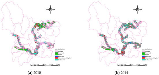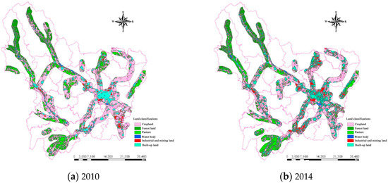 Land use within buffer zones along the roads of Wu’an in (a) 2010 and (b) 2014.