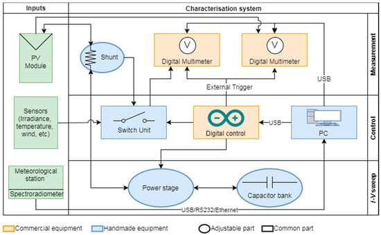 The proposed system uses general-purpose instrumentation, which can be acquired with a respective calibration certificate from the manufacturer. In this way, the accuracy and precision of the measurements is ensured. The use of the same framework to measure single cells, modules, strings, or a whole PV generator has been another goal of the I-V characterization system. In this sense, interchangeable parts can be easily replaced to adjust the system to the power of the device under test using the same software. Lastly, both hardware and software are open, and can therefore be modified according to the specific requirements of the user.