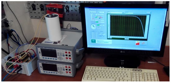 The measurement block includes specific instrumentation with calibration certificates, which delimits the error associated with the measurement and it is generated as a result of the periodic calibration. Any specific instrumentation can be used for this purpose. It only has to include a series of characteristics to be satisfactory: (a) communication to the PC through any kind of communication protocol; (b) the use of an external trigger to synchronize the voltage and current measurements; (c) enough buffer to store the measurement of each I-V curve; (d) enough sampling frequency to measure the desired number of points during the charge of the capacitor; and (e) the capacity of measuring different types of temperature sensors. Definitely, any mid- to top-range multimeter of any recognized brand can fulfill the necessary requirements. In the proposed set-up, the measurement block is composed off two Agilent 34411A multimeters to record the voltage and the current values simultaneously. One of them is used to measure the voltage across the terminals of the PV device. The second one is used to measure the current by means of the voltage drop across a shunt resistor between the device and the capacitor. In addition, the second multimeter also measures the operation conditions. Both multimeters are synchronized by a shared external trigger signal generated by the digital control system.