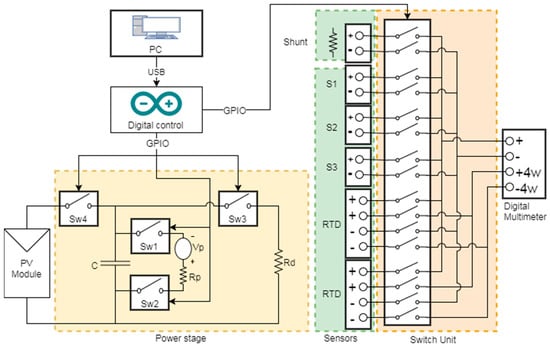 A complete literature review of examples for each type of system can be found in Piliougine et al. []. That paper, like many others [,,], proposes a system that uses a four-quadrant power supply to bias the module. This accurate way of plotting the I-V curve has the inconvenience of its price. Indeed, in most of these works, the objective was to design an accurate system to obtain I-V curves of PV cells or modules without paying attention to the cost of the used equipment. However, for the last five years, many works are aimed to reduce the final price of the system.