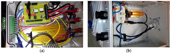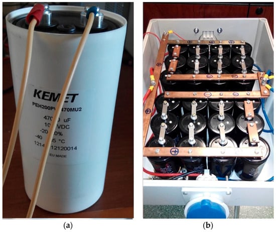 Two capacitor banks used to measure photovoltaic generators of different sizes: (a) a single capacitor able to measure any commercial module; (b) a capacitor bank used to measure PV generators up to 200 kWp.