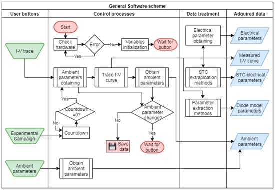 A personal computer is necessary to control the Arduino board and to process the measurements performed by the multimeters. The Arduino board and multimeters are connected to the PC by USB ports, so the PC must count with at least three USB ports. The use of this port—widely present on the PC market—rather than other ports such as GPIB or PXI makes the experimental set-up more suitable for laboratories with a reduced budget. As was mentioned before, a software application developed using LabVIEW from National Instruments [] will run in the computer. The general schematic is presented in Figure 6, in which the principal control processes are activated by three user buttons. The main function of this software is to control the acquisition of the I-V curve and perform campaigns of measurements automatically. A campaign of measurements will be carried out, as this program can be easily configured to manage different PV devices—and consequently, different capacitors banks. The application is capable of processing measurements to obtain the main electrical parameters of the PV device (ISC, VOC, Pmax, current at the maximum power point (IPmax), voltage at the maximum power point (VPmax) and FF), extrapolating them to STC using different methods [,,,], and extracting different intrinsic parameters from the single-diode model (photo-generated current (Iph), saturation current (I0), serial resistance (Rs), ideality factor (m), parallel resistance (Rsh)) using the methods described in [,,]. All the acquired data are shown on screen and saved when the I-V curve is validated, that is, when the ambient parameters have no significant differences before and after the trace of the curve.