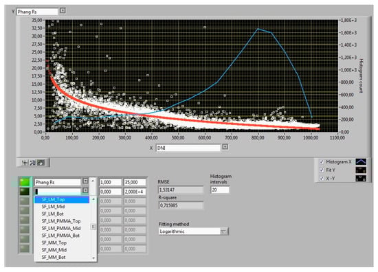 Window for using the parameter extraction methods. Example of serial resistance (Y-axis) parameter as a function of the direct irradiance (X-axis) in white points, logarithmic fit in red line, and data histogram in blue line.