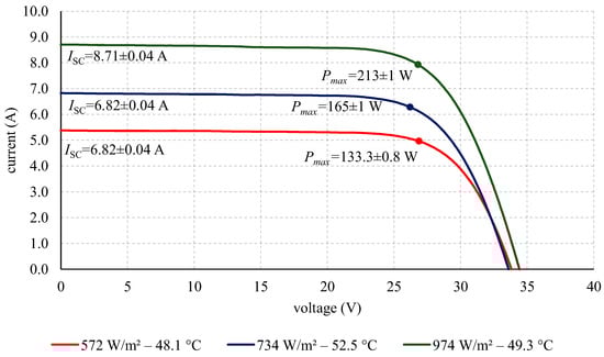 In order to illustrate the practical use of the expressions previously described, three examples of I-V curves under different weather conditions are measured for a commercial photovoltaic module Sharp NU245J5 and the results are exposed in Figure 10. In addition, the values of the irradiance G, the cell temperature Tc, the short circuit current ISC, the open circuit voltage VOC, the maximum power Pmax, and the fill factor FF are obtained for each measured curve and their respective uncertainties are calculated accordingly to the set of expressions provided previously. The results are shown in Table 3. Moreover, the specifications of the PV modules are shown in Table 4.