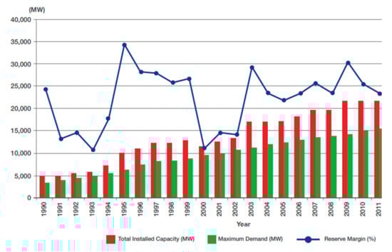 The average electricity tariff in Malaysia increased by 15% in January 2014, from the average rate of MYR 0.3354/kWh (USD 0.0906/kWh) to MYR 0.3853/kWh (USD 0.104/kWh) []. The increase in electricity rates is to stabilize the country’s economy by dipping fuel subsidies for the power sector. Besides, the increase in electricity price is inevitable as the price of fossil fuel continues to upsurge. In regards to new generating plants, Figure 1 shows the increasing trend of total installed generation capacity and maximum demand in Malaysia. Commercial and industrial sectors are the major contributors of total energy consumption, followed by residential, transportation, and etc. The continuous increase in the maximum demand necessitates further new power plants and grid reinforcement to cater for energy demand in Malaysia []. Tenaga Nasional Berhad (Kuala Lumpur, Malaysia) (TNB), the sole provider and distributor of electricity in Peninsular Malaysia predict that the peak demand will reach up to 20,669 kW by 2020. TNB has stated that the demand for electricity is being driven by economic growth, which is anticipated to raise at an annual rate of 3% up to 2030.