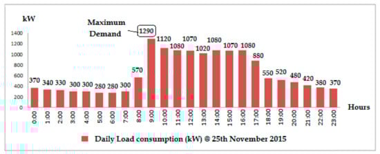 Most tariffs are designed to help customers to limit their electricity usage during peak hours. Based on Figure 3 and Table 2, the load profile data for the month of November 2015 for C1 category customer (Malaysian institution) has revealed that the MD of 1290 kW was captured on 25 November 2015 at 9.00 a.m., which came up to RM 39,087.00 apart from the total net consumption of RM 129,330.45. Table 2 shows that the total electricity bill is RM 168417 for the month of November 2015, where 23% and 77% charges are maximum demand and net consumption respectively.