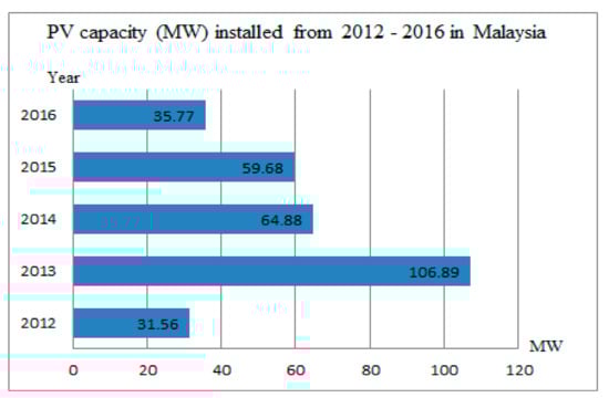 Photovoltaic (PV) installed capacity (MW) from 2012–2016 in Malaysia [].