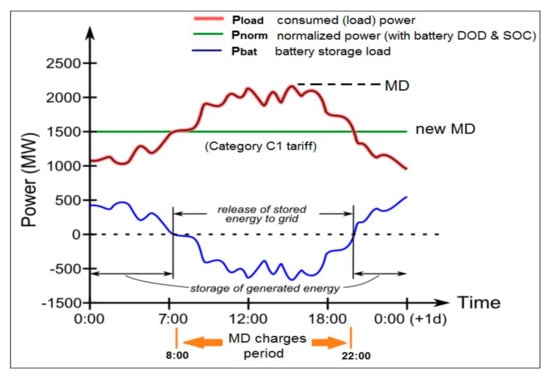 The rapid depleting conventional energy sources and today’s continuously increasing energy demand have led to the intensive research for new, more efficient, and green power plants, with advanced technology. In recent times, new energy and clean fuel technologies are being intensively pursued and explored due to the increasing environmental concern worldwide [,]. The increased penetration rate of solar photovoltaic (PV) generation systems in the utility grid reduces greenhouse emission, increases energy independence, and improves the reliability of the infrastructure. Solar PV systems can also offer an alternative solution to the reduction of maximum demand (MD) because of the capability to supply power during peak hours. Unfortunately, environmental factors, such as irradiation and changes in the temperature, affect the output power of a solar PV. The sporadic characteristics of a solar PV generation system reduce the power quality of the utility grid [,,,,,,,]. The use of batteries in combination with PV systems in commercial buildings and industries are expected to become a widely applied energy storage solution to cater for peak shaving and peak shifting.