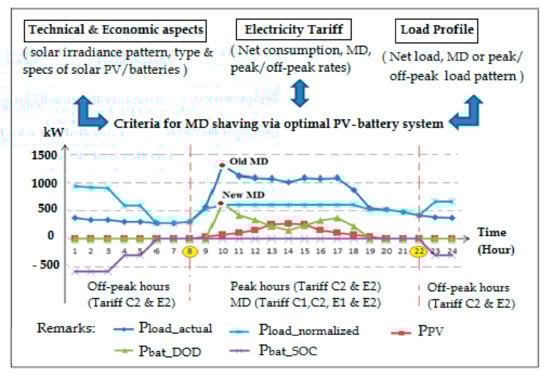 The main focus of all the reviewed articles is to determine the optimal combination of PV system size and battery capacity. Apart from the influence of interest rates, the maximum possible energy savings, especially peak demand reduction via optimal PV and battery system, need to be determined for a higher return on investment. Based on the studies, as per Figure 7, to achieve a high maximum demand reduction, solar PV, and battery system relies on a few criteria, such as load profile, technical and economic aspects, and electricity tariff. In terms of load profile, the load consumption data from two to three years of the commercial or industrial will be sufficient to reveal the consistency of the load pattern in terms of maximum demand and total kWh during off-peak and peak hours.