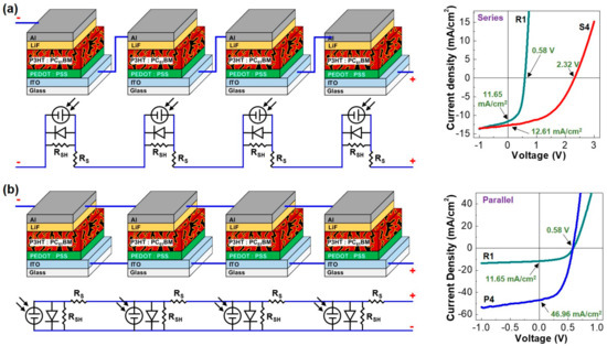 Semi-solar modules by series and parallel connections of single P3HT:PC61BM solar cells (R1): (a) Series connection of four single cells (S4, left top), simple equivalent diagram for series connection (left bottom), and light J-V curves (right); (b) Parallel connection of four single cells (P4, left top), simple equivalent diagram for parallel connection (left bottom), and light J-V curves (right).