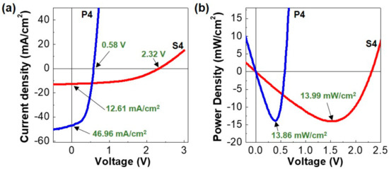 Comparison of semi-solar modules according to the connection type: (a) Light J-V characteristics for the semi-solar modules with series (S4) and parallel (P4) connections of four single cells; (b) Power density as a function of voltage for the semi-solar modules in (a) (see the maximum power density (PMM) values indicated by the black arrows).