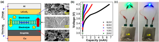 Device structure and performance of a lithium ion battery (LIB) fabricated in this work: (a) Schematic illustration for the cross-sectional structure of the LIB and SEM images for core materials (LiCoO2, separator, and graphite layers); (b) Voltage-capacity characteristics according to the charging rate (0.2 C~2.0 C); (c) Photographs for the operation of light-emitting devices (LEDs) (green and blue) using the LIBs fabricated in this work.