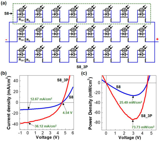 Extended semi-solar modules by series and parallel connections of single P3HT:PC61BM solar cells: (a) Simple equivalent circuit diagram for the connection of eight single cells in series (S8) and the parallel connection of three S8 blocks leading to S8_3P; (b) Light J-V characteristics for the extended semi-solar modules; (c) Power density as a function of voltage for the extended semi-solar modules in (b) (see the maximum power density values indicated by the black arrows).