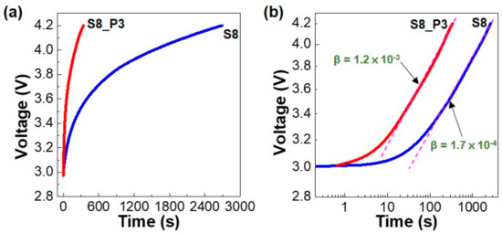 Charging characteristics of the fabricated LIB packs by using the extended semi-solar modules (S8 and S8_3P) under one sun condition (100 mW/cm2): (a) Voltage-time (V-t) characteristics on a linear scale; (b) Voltage-time (V-t) characteristics on a full logarithmic scale (see the charging rate constant values obtained by applying the power law equation, V = α∙tβ, as indicated by the black arrows).