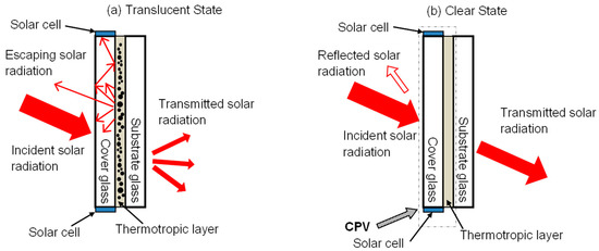 Recently, an innovative design of a Concentrating PV (CPV) smart window system has been proposed to integrate renewable energy technologies and energy savings technologies into current window systems [11,12], as shown in Figure 1. The CPV design involves optically coupling PV cells around the edges of a glazing unit with a thermotropic layer laminated within. Above a certain threshold temperature, the thermotropic layer is thermally activated to scatter light within the glazing unit directing a high proportion of this scattered light via total internal reflection toward the solar cells. Below the designed threshold temperature/transition temperature (Ts), the thermotropic material (e.g., polymer) is water-soluble and therefore the layer appears transparent as shown in Figure 1b. Above the threshold Ts the water and polymer components separate and the thermotropic layer becomes translucent with a diffuse reflectivity, which is ascribed to the soluble-to-insoluble phase transition of the thermotropic material. The relatively high reflectivity induced by this thermotropic layer leads to scattering of the majority of incoming sunlight, which, when harvested by the integrated solar cells, results in the generation of renewably sourced electricity [11,12], as shown in Figure 1a.