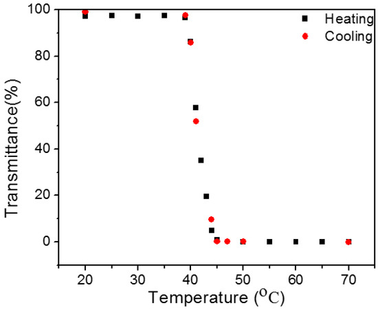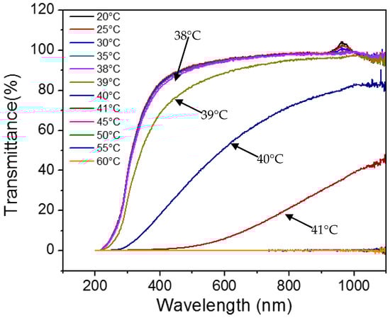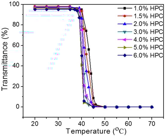 A typical UV-Vis transmittance spectrum with increased temperature for an aqueous solution of HPC is shown in Figure 2 whereby most transmittance below the Ts occurs in the near infrared and visible light regions. From Figure 2, it can be seen that transmittance decreases upon increasing the liquid temperature, being approximately 100% below 38 °C and near 0% when above 45 °C. There is no significant difference for the transmittance data from 20 °C to 38 °C.