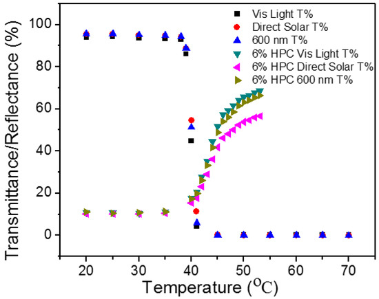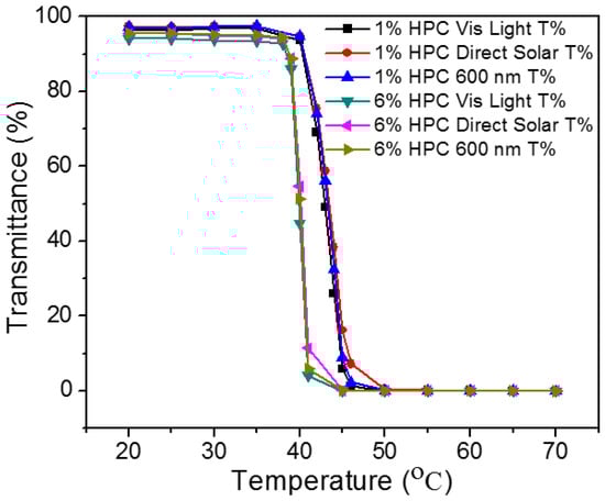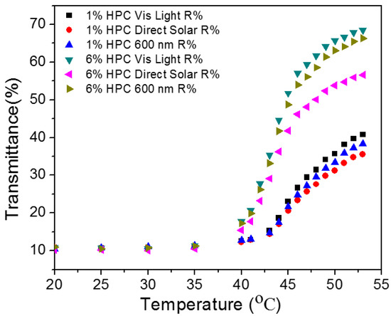 Figure 5 shows the averaged transmittance values calculated using Equation (1) (labelled as Vis Light T%) and Equation (2) (labelled as Direct Solar T%) for the 1 wt. % and 6 wt. % HPC samples. For a given sample, the similarity in transmittance values calculated at all stages of the heating process indicates that reliable transmittance data can be assumed from the 600 nm transmittance values that are recorded directly during experiments and so this is the data reported in the rest of this paper.