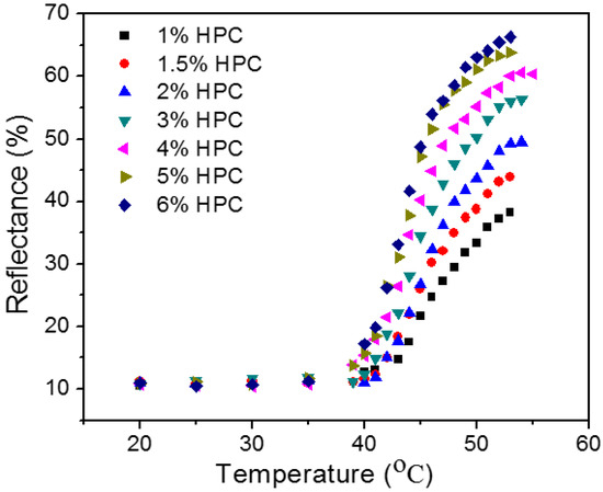 The variation of the reflectance under spectra of 600 nm of the selected wt. % of HPCs under different temperature.