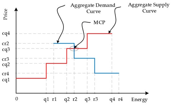 Upon reception of the DER bids and LMP information, the DSO runs its energy auction to allocate energy for least cost operation and clears the market at MCP, i.e., DLMP. An illustration of the MCP as the intersection of the traditional aggregate supply-demand curves is shown in Figure 1. Note that the LA does not place any monetary bid in its first block; therefore, the aggregate demand curve is shifted by an amount equal to the base load, i.e., r1. While accounting for grid constraints, the DLMPs are obtained as the Lagrange multipliers of the supply-demand balance constraint at each distribution bus in the DSO’s scheduling problem for social surplus maximization. Pricing based on DLMP is extensively used in literature for distribution system congestion management, market clearing, and loss minimization [,,,], as it shows the true marginal cost of supplying the next increment of load.