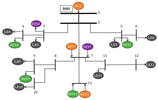 Radial IEEE 13-bus distribution system with different types of distributed energy resources (DERs) on each bus.
