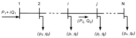 In this study, simplified DistFlow equations that have been extensively used in the literature [,,,,] have been adopted to set up the distribution system grid constraints. For a radial distribution feeder, as shown in Figure 3, simplified DistFlow equations for every line segment can be written as in Equations (2)–(4) for all time :