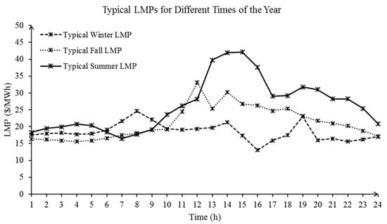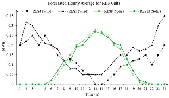 A typical 24-h winter LMP [], as shown in Figure 4, was used as the bid of the wholesale market. The forecasted hourly generation of the RESs are shown in Figure 5. Due to its non-dispatchable nature, the RES’s generation is considered as a negative fixed load demand and is cleared at DLMP. As seen in Figure 4, the LMP varies from $15/MWh to about $42/MWh. Both EES bids are set to allow charging at 20 $/MWh and discharging at 25 $/MWh. These cost limits are chosen in order to clearly show the charging and discharging schedules of the EES units. Other cost limits can also be applied to the proposed model. Note that a realistic levelized cost of storage (LCOS) constraint should be imposed on the bidding price of the EES units. The LCOS calculation for the EES to participate in the distribution market would account for a number of important factors, including the capital cost, battery degradation, installation labor, operation and maintenance cost, investment tax credit and so on []. The calculation of the LCOS is out of the scope of this paper, but the LCOS constraint can be straightforwardly included in the proposed MILP model. EES units charging/discharging bids, as well as its other parameters, are listed in Table 1.