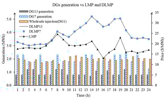 Because of varying LMP throughout the day, DERs and injection from the wholesale market are commissioned at various capacities. As LMP increases, the injection from the wholesale market decreases and the DG’s output increases. This result is depicted in Figure 6 for the DG’s output and the corresponding DLMPs at Buses 1, 7, and 13. DLMPs are calculated by the Lagrange multiplier of the power balance constraint, which shows the marginal price for serving the next MWh at each bus. DLMP 7 and 13 overlap as serving the next increment of load at these buses is equivalent in this case.