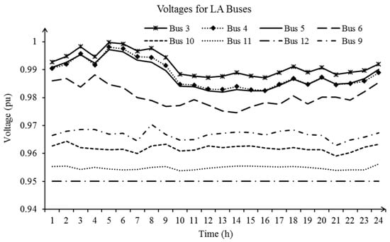 Results of bus voltage magnitudes are within the normal operation limits and are shown in Figure 8 according to the constraint in Equation (8). Notice that buses further away from the substation exhibit higher voltage drops.
