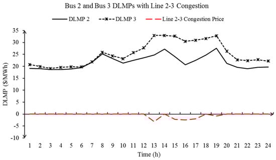 DLMP at Bus 2, 3, and the effect of congestion at Line 2–3.