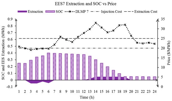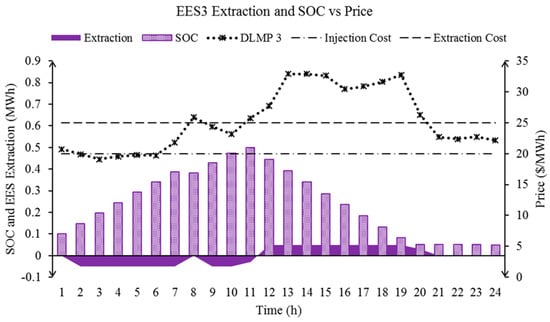 The charge/discharge schedules of the EES units are also dependent on the DLMPs of the buses on which they are located. This result is depicted in Figure 11 and Figure 12 for EES units at Buses 3 and 7 respectively. Here, the dotted graph with markers shows DLMPs and the horizontal lines show the cost of energy injection and extraction of the EES units. The bars and the height of the shaded area show SOC and the amount of energy extraction (charging when negative and discharging when positive) from the EES units respectively. In general, when DLMP is lower than the cost of injection of the EES unit, it is scheduled for charging. Similarly, when DLMP is higher than the cost of extraction, the unit is scheduled for discharging. The SOCs of the units also follow DLMPs, i.e., increase at lower and decrease at higher prices. Note that EES3 at Bus 3 is unable to completely charge until hour 8 since its initial SOC is 0.1 MWh, and the maximum charging rate is 0.05 MW. Furthermore, despite higher DLMPs than the injection cost, it is scheduled for charging during hours 9 to 11. This occurs because DLMPs are much higher later during hours 12 to 20 and it is efficient to charge the unit at slightly higher prices initially, and discharge it at much higher prices later on. This outcome, however, does not ensue in EES7 at Bus 7. This is because the initial SOC of this unit is 0.25 MWh and it is able to fully charge to its maximum limit of 0.4 MWh at lower prices from hours 2 to 7 and discharge during high DLMP from hours 13 to 20.