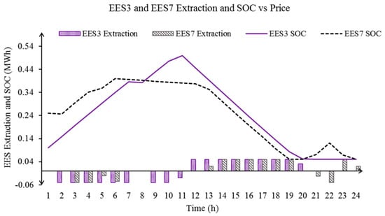 In Figure 11 and Figure 12, the minimum charging/discharging hours of both EES3 and EES7 were set to 3 consecutive hours. To illustrate the associated constraints, i.e., Equations (23)–(35), are properly met, the minimum charging/discharging hours of EES7 was decreased to 2, and its resulting schedule along with the schedule of EES3 was plotted in Figure 13. In this case, notice that EES7 is allowed an extra cycle of charge/discharge during hours 21 to 24 for further profit, where this schedule change was not possible for the case with 3 minimum charging/discharging hours. The effect of self-discharge can also be seen by the slight slope of SOC of EES7 from hours 6 to 13.