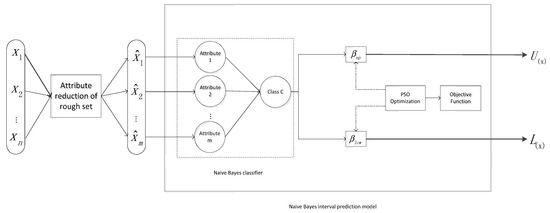 Probabilistic interval forecasting is composed of an upper and lower boundary with a certain probability level. As shown in Figure 1, this paper constructs an upper and lower bound estimation model of RS-PSO-NBC. After the original input, was put into a rough set to remove irrelevant attributes, the significant inputs identified by RS are used as conditional attributes for the NBC. The NBC uses the data distribution hypothesis and prior knowledge to classify power into a reasonable class. Then, the dual output bounds of upper and lower for the wind power are calculated with optimized weight (the upper-weight and the lower-weight ) by PSO. The detailed prediction process is described below.