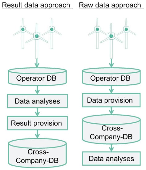In the second case (raw data approach) all analyses are conducted by the data trustee. For this purpose the operators still collect all data from the WT and forward a predefined data set of raw data to the cross-company-database. Analyses carried out by the operators are used only for internal purposes and for alignment. The rest of the process remains the same. In this approach consistent results can be assured and additional analyses added. The main advantage is the more detailed knowledge on the single turbine failures. By combining failure information and operational data, detailed reliability characteristics (e.g., failure distribution) can be derived while the first approach enables only basic results (e.g., failure rates). On the other hand this approach requires a larger and more powerful database and leads to higher effort in data transfer and standardization of the raw data.