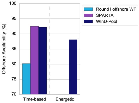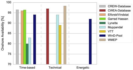 Time-based availability (At) provides information on the share of time where a WT is operating or able to operate in comparison to the total time. Various definitions for the calculation of time based availability exist in the wind sector. Standardized definitions are provided by the IEC 61400-25-1 []. The definition used in this paper follows the “System Operational Availability” of the IEC-Standard where all down time except for low wind is considered as not available. Time-based availability can be calculated according to Equation (2).