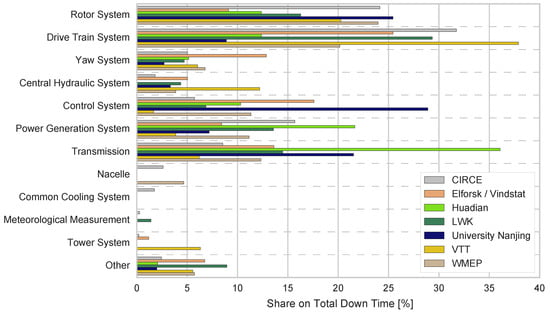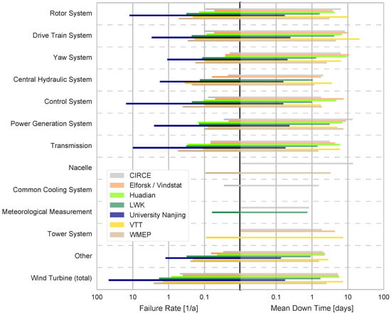 Su et al. present results of a reliability analysis carried out for a WF in the Jiangsu Province of China. The WF consists of 108 WT which were constructed in two individual projects. Thus, the data set includes two different turbine types (1.5 MW and 2 MW) and two different manufacturers. All turbines were commissioned between 2009 and 2011. The analyzed data was gathered between 2009 and 2013 as well as between 2011 and 2013 respectively. According to an unique system structure, the study differentiates 11 different systems of the WT. Failure information is extracted from the SCADA-System and the authors state that WT are simply restarted in many cases. Hence, failure rates are high and average down times are low compared to other statistics []. To enable a comparison, partial results of the single WF projects are aggregated.