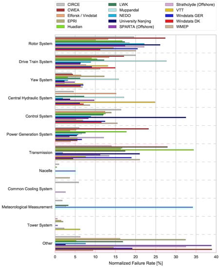 The SPARTA (System Performance, Availability and Reliability Trend Analysis) initiative was formed in 2013 by operators of offshore WF in the UK. Initiated by The Crown Estate, the Initiative is managed by ORE Catapult. SPARTA is following the result data approach and gathers Key Performance Indicators (KPI) from participating operators, which are used as a basis for monthly benchmark reports. All KPIs are provided as aggregated values on WF level. Reliability figures (repair rate instead of failure rate) are reported on the subsystem level according to Reference Designation System for Power Plants (RDS-PP®) (Section 5.1). To date, the latest available results were published in March 2017 and are based on 14 months of data (April 2015–May 2016) belonging to 1045 WT (19 WF, 3.55 GW) []. All results are presented as figures and lacking detailed labels. Thus, all values have to be estimated to add them to the present comparison and are somewhat imprecise. Values are calculated as weighted average based on the number of WF if needed.