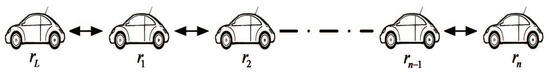 As shown in Figure 1, a string of autonomous vehicles move in a platoon, which includes a leader vehicle and n followers. Additionally, each follower regulates its motion according to the received information (e.g., position, velocity, acceleration, etc.) from its neighboring vehicles. The longitudinal dynamics of the i-th vehicle can be described by: