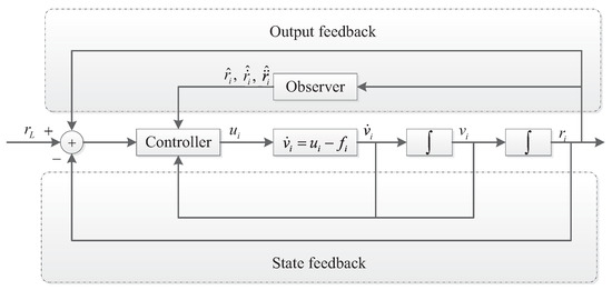 In this section, two algorithms are developed, with the first algorithm in Section 3.1 requiring the information (position, velocity, acceleration) of neighboring vehicles, while the second algorithm in Section 3.2 requires only the position information of neighboring vehicles. In order to better present the control structure and the signal flow, a block diagram is provided for our proposed system in Figure 2.