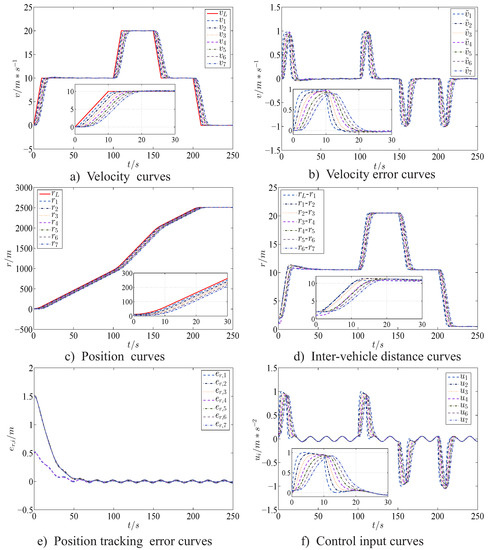 The simulation results are shown in Figure 4. The tracking performances of velocities and velocity tracking errors are shown in Figure 4a,b, respectively. The position curves of vehicles and the inter-vehicle distance curves are shown in Figure 4c,d, which demonstrate that the vehicles in the platoon can move with safe inter-vehicle distance and avoid collisions. In addition, we can see that the inter-vehicle distance between two vehicles is related to the velocity of the vehicle from Figure 4d. It can be seen from Figure 4e that the string stability of the vehicle platoon is achieved, i.e., . The control input curves are shown in Figure 4f.