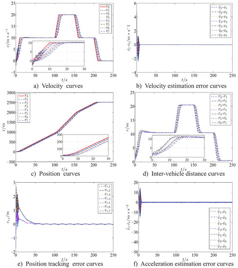 From Figure 5a,b, it is clear that the convergence of the tracking performance of velocity is excellent, and the velocity estimation errors converge to a small region eventually. Meanwhile, the position curves and inter-vehicle distance curves are shown in Figure 5c,d, which are as good as those in Figure 4c,d. The position tracking error curves are shown in Figure 5e, and it is clear that . Meanwhile, it can be seen from Figure 5f that the observation errors of acceleration are limited to a small region.