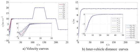 Figure 6a,b shows the tracking performance of the control algorithm in [31]. It should be noted that the inter-vehicle distance converges to a constant value (10 m) in Figure 6b. Compared with the results in Figure 4d and Figure 5d (the inter-vehicle distance is related to the velocity of the vehicle, i.e., when m/s and 20 m/s, m and m, respectively), the control effects using the protocol in [31] seem too rigid. In addition, it should be pointed out that the algorithm in [31] achieves the control effects in Figure 6 by using state feedback. Above all, the proposed algorithm in this paper is more practical and pragmatic.