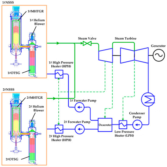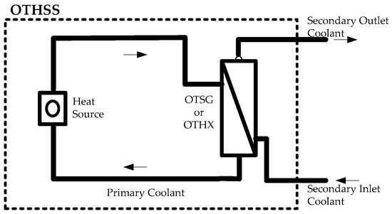 Distributed energy systems can be built by electrical interconnection of power plants through the grid [1] and can also be built by thermal interconnection [2] of homogeneous or heterogeneous once-through heat supply system (OTHSS) modules based on fluid flow networks (FFNs). As shown in Figure 1, OTHSS refers to a thermodynamic system composed of a heat source, primary coolant circuit(s) and once-through steam generator(s) (OTSG) or once-through heat exchanger(s) (OTHX), whose heat source can be fired-coal, nuclear fission reaction, solar and etc. The coolant inside the primary circuits is used to absorb the heat from the source and transfers it to the secondary coolant through OTSGs or OTHXs. The secondary coolant is injected to the secondary side of the OTSGs or OTHXs and is changed to be the satisfactory working fluid for driving different thermal loads such as a steam turbine. Actually, OTHSS are very common in practical engineering such as the integral pressurized water reactors (iPWR, e.g., Nuscale, IRIS and mPower) with internal OTSGs [3,4,5,6], modular high temperature gas-cooled reactor (MHTGR, e.g., HTR-Module [7,8,9], MHTGR [10] and HTR-PM [11,12,13]) with side-by-side arranged OTSGs, concentrating solar power (CSP) plants with OTSGs [14] or OTHXs [15] and even coal-fired once-through boilers. A thermally interconnected distributed energy system is called a hybrid energy system (HES) [16,17,18] if the heat sources of OTHSS modules are of different types, otherwise it is called a multimodular energy system.