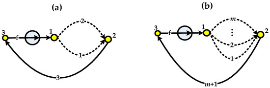 FFNs can be used to build multimodular nuclear plants based on small modular reactor (SMRs) which are defined to be those fission reactors with electric power no more than 300 MWe. Figure 2 illustrates the schematic diagram of a two-modular IRIS-based nuclear plant [19], where the live superheated steam flows of 331 °C/5.8 MPa provided by the two IRIS-based nuclear steam supply system (NSSS) modules are combined together to drive the turbine and the condensed water are then pressurized by the feedwater pump and distributed to each IRIS module by the valves. The secondary-side of the fluid flow network (FFN) that interconnects these two IRIS modules of the plant is shown by Figure 3a, where branch f is the pump branch including the feedwater pump, branch i is the secondary side of the ith IRIS module (i = 1, 2) and branch 3 composes of the equipment such as the turbine, condenser, deaerator, etc. Similarly, m-modular IRIS plant can be realized by the parallel operation of m IRIS module through feedwater distribution and steam combination and the corresponding secondary FFN is illustrated by Figure 3b. Moreover, Figure 4 shows the simplified diagram of a two-modular MHTGR-based nuclear plant HTR-PM which is under construction at China, Shandong Shidao bay, where the NSSS module is mainly constituted by a pebble-bed MHTGR, a primary helium blower and a side-by-side arranged OTSG, each NSSS module is independently equipped with a feedwater pump and the live steam flows from multiple modules and with the parameters of 571 °C/13.9 MPa are combined to drive the turbine [13]. The secondary FFN of HTR-PM plant is shown by Figure 5a and the FFN corresponding to the m-modular MHTGR plant with independent feedwater strategy is shown by Figure 5b [20]. From Figure 2, Figure 3, Figure 4 and Figure 5, if the live steam parameters of different NSSS modules are identical, then these modules can be integrated by parallel operation, based on which the strong safety feature of SMRs can be applicable to large-scale nuclear plants at any desired power ratings.