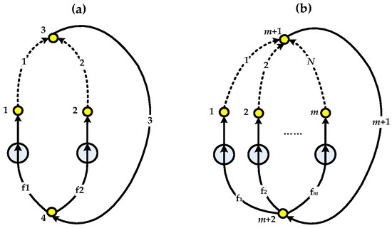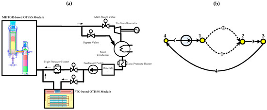 Moreover, FFNs can also be applied to build nuclear-solar HESs by integrating the OTSSS modules based on NSSS and CSP. For CSP modules, the parabolic through collector (PTC) system and solar power tower (SPT) system are two significant types [21]. The PTC system consists of a group of reflectors that are curved in on dimension in parabolic shape to focus sunrays onto an absorber tube mounted in the focal line of the parabola. The SPT system uses a field of heliostats to reflect and concentrate the sunrays onto a central receiver placed in the top of a fixed tower. Both the PTC and SPT systems can power a secondary steam circuit and Rankine power cycle. Based on the secondary FFN given by Figure 3 or Figure 5, e.g., the SPT-based OTSSS proposed in [12] can be integrated in parallel with the MHTGR-based OTSSS introduced in [13] to realize a HES shown in Figure 6 if the live steam parameters of these heterogeneous OTSSS modules are identical. Furthermore, a nuclear-solar HES can also be realized by serial integration of different modules, e.g., Figure 7 gives the schematic diagram of a serially integrated HES [13], where a PTC-based OTHSS is adopted to heat up the feedwater flow of a MHTGR-based NSSS module in parallel with a high-pressure heater (HPH). Here, in Figure 7b, branch f is the pump branch including the feedwater pump, branch 1 contains the original HPH, branch 2 is the secondary side of the PTC-based module, branch 3 is the secondary side of the OTSG of the MHTGR-based module and branch 4 composes of the equipment such as the turbine, condenser, deaerator and etc. Through the heterogeneous integration scheme shown by Figure 7, there is less necessity of storage devices with large capacity for the CSP-module, which leads to system simplification and cost reduction. Moreover, there is higher steam parameters, which induces better turbine efficiency. Therefore, based on the above introduction as well as the instances shown in Figure 2, Figure 3, Figure 4, Figure 5, Figure 6 and Figure 7, FFN is central in thermally integrating homogeneous or heterogeneous OTHSS modules with parallel, serial and some other integration manners.