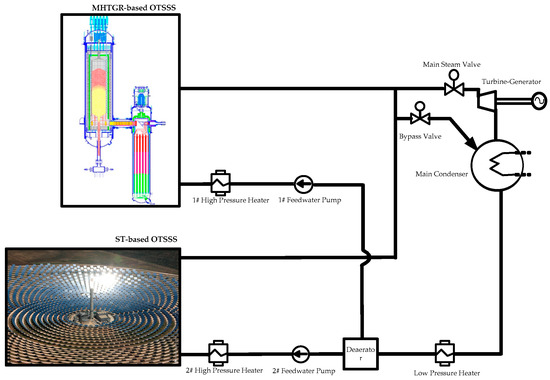 A nuclear-solar hybrid energy system (HES) constituted by an MHTGR-based and a solar power tower STP-based OTSSSs.