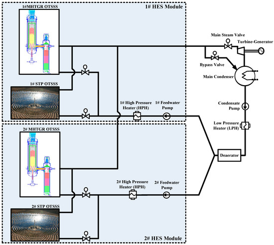 Schematic diagram of a nuclear-solar multimodular hybrid energy system (HES).