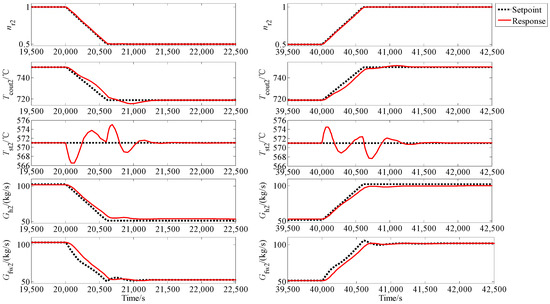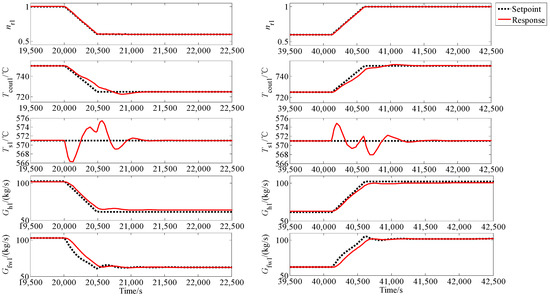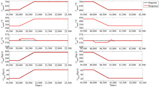 respectively. In this simulation, the network parameters are chosen to be Ki = 0.1 (kg/MPa∙s2) (i = 1, …, 5), R1 = R2 = 0.006 MPa/(kg/s)2, Rf1 = Rf2 = 0.0001 MPa/(kg/s)2 and the parameters FFN pressure-flowrate controller (56) are set to be Γd = 0.5I2, Πd = 100 I2, , Γcc = 0.05 , Πcc = 200 , , Γa = 0.01 , Πa = 1 × 103 and . The MHTGR-based OTSSS control adopts the one given in [34]. For the STP-based OTSSS, molten salt flowrate is utilized to regulate the receiver outlet temperature and feedwater flowrate is applied for regulating the live steam temperature, where PI algorithms are adopted [35,36]. The case study of the ramp switch from the nuclear to solar power and its inverse are studied in this numerical simulation which was done in Matlab/Simulink.