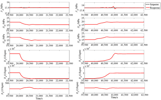 Responses of main steam pressure, feedwater header and branch resistances, Pst: main steam pressure, Hf1 and Hf2: header given by 1# and 2# feedwater pump, Ri: fluid resistances in branch i (i = 3, 4, 5).