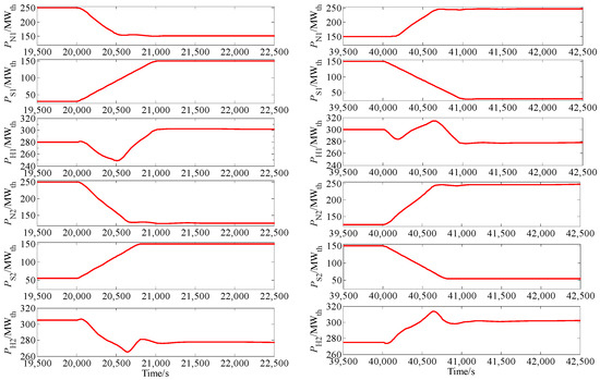Responses of thermal powers, PNi: thermal power of i# MHTGR-based OTSSS, PSi: thermal power of i# STP-based OTSSS, PHi thermal power of i# HES module composed of i# MHTGR-based OTSSS and i# STP-based OTSSS (i = 1, 2).
